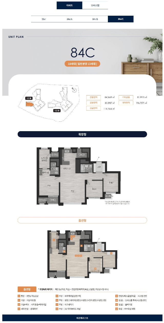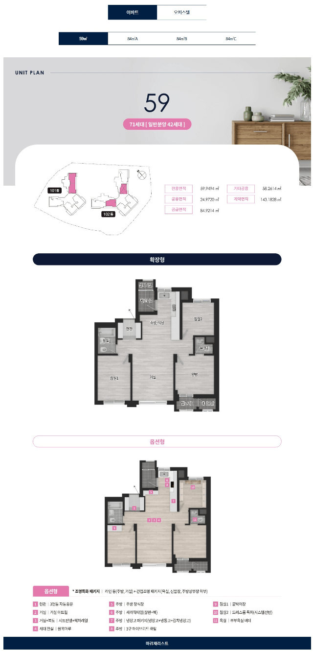 총 199가구 중 108 가구가 분양됩니다. 실수요자들에게 가장 인기 있는 전용 59제곱미터 25평과 84제곱미터 34평 평면이 있습니다. 59제곱미터 25평 평면은 3 베이 구조로 팬트리나 드레스룸이 제외되었고 거실, 주방, 침실 3개, 화장실 2개로 구성되어 있으며, 환기와 맞통풍이 가능한 설계입니다. 34평은 A부터 C타입으로 나뉘며, A타입과 C타입은 4 베이 판상형으로 가장 인기 있는 평면으로 드레스룸도 넓은 것이 장점입니다. 팬트리 공간까지 확보한 B타입은 주방과 거실을 가로로 붙인 젊은이들에게 인기 있는 타입인 타워형 설계입니다.